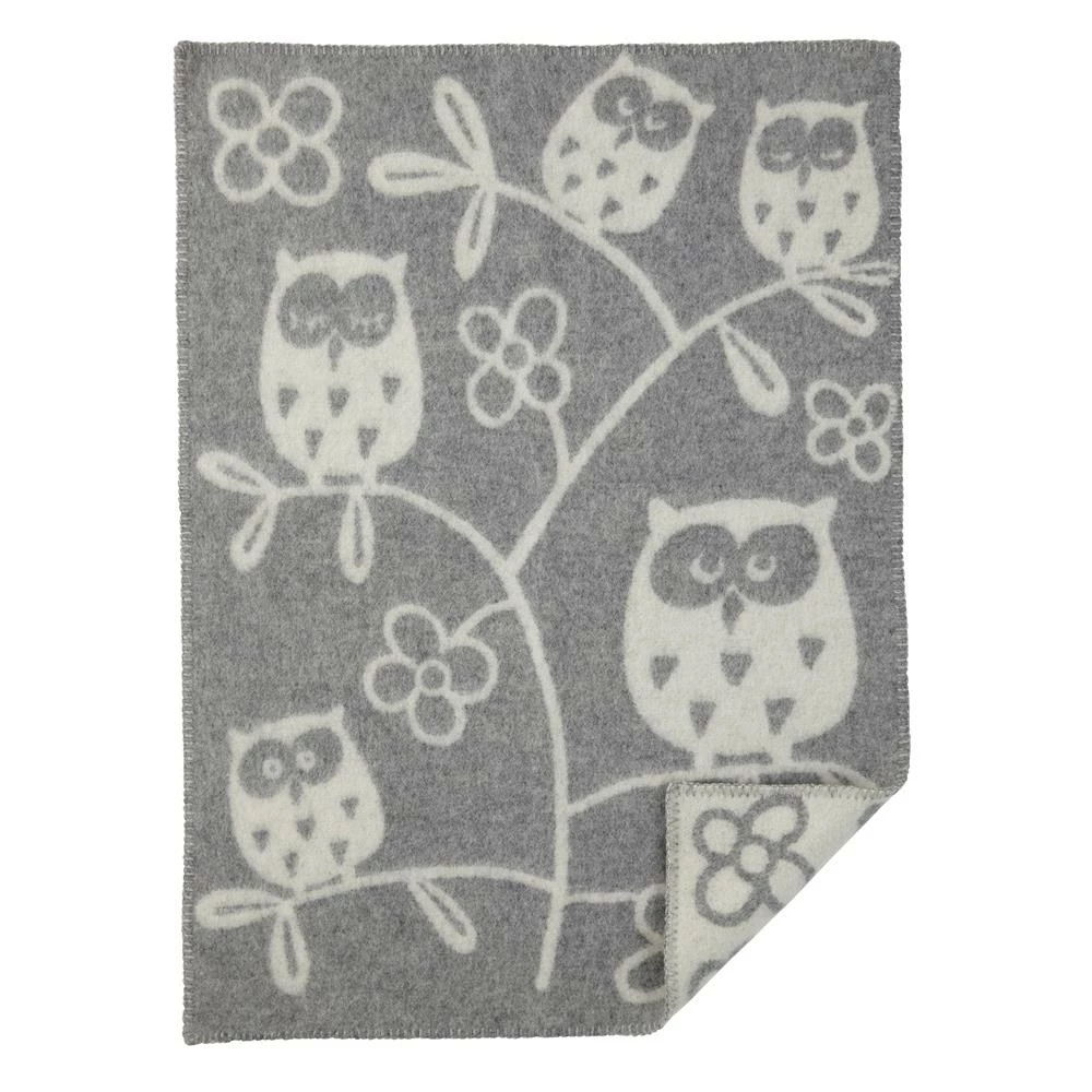 Dit aangename, warme wollen kinderdeken met uilen en takken als motief is beschikbaar in drie kleuren: bruin, donkergrijs en groen. Perfect voor op de kinderkamer op een koude nacht.